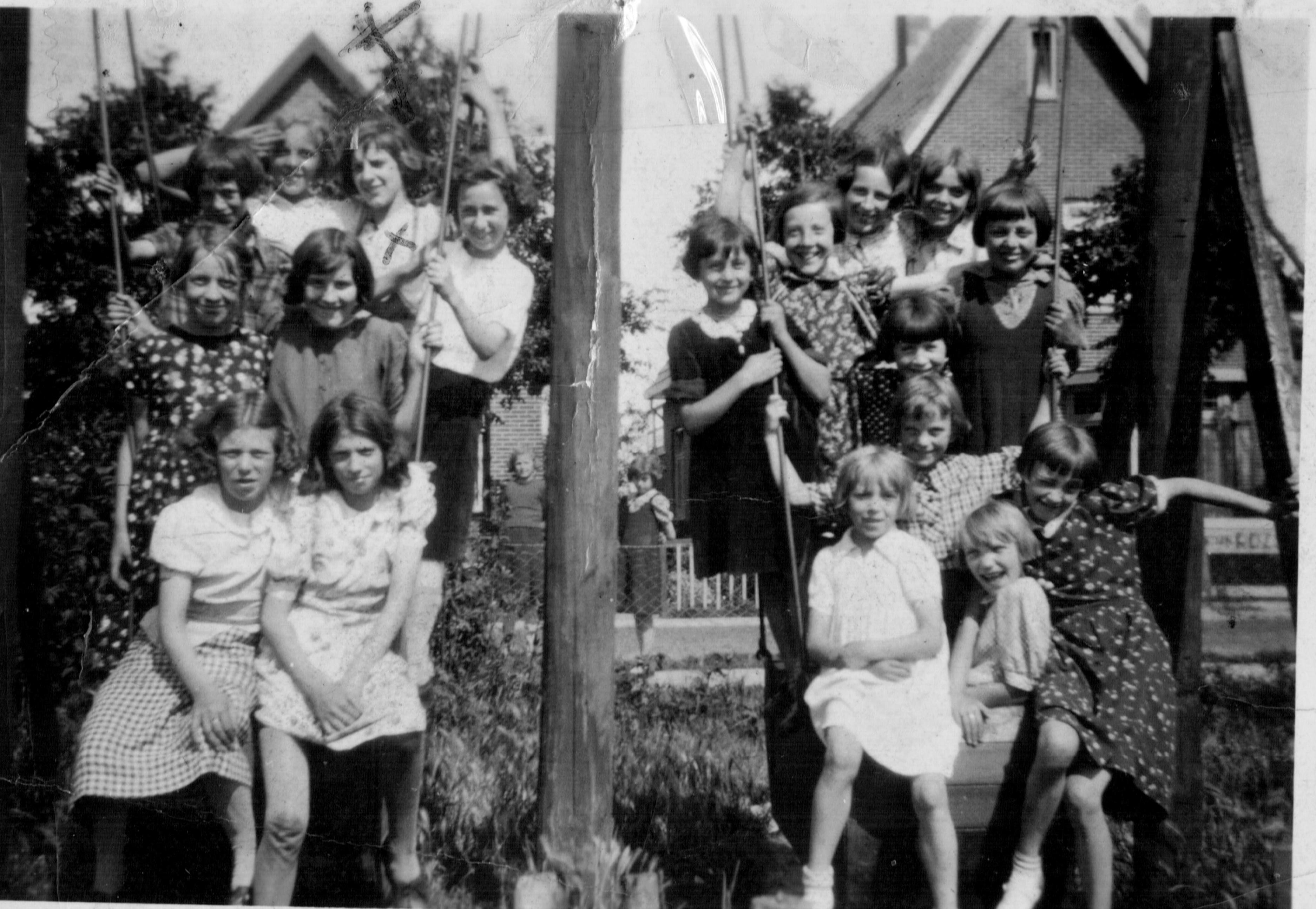 Ella on the swings at the day school with seventeen other children, ca. 1938. Ella (marked with an X) is on the left, in the back row.