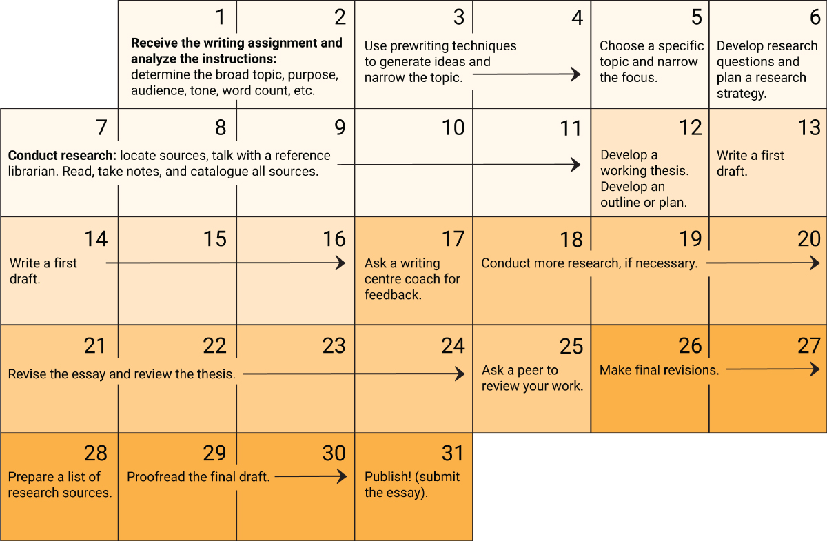 To help you succeed in a variety of writing tasks, the remainder of this textbook offers detailed guidance on specific aspects of writing: the writing process, essential elements of paragraphs and essays, characteristics of common post-secondary writing assignments, research and documentation, style, grammar, and punctuation.