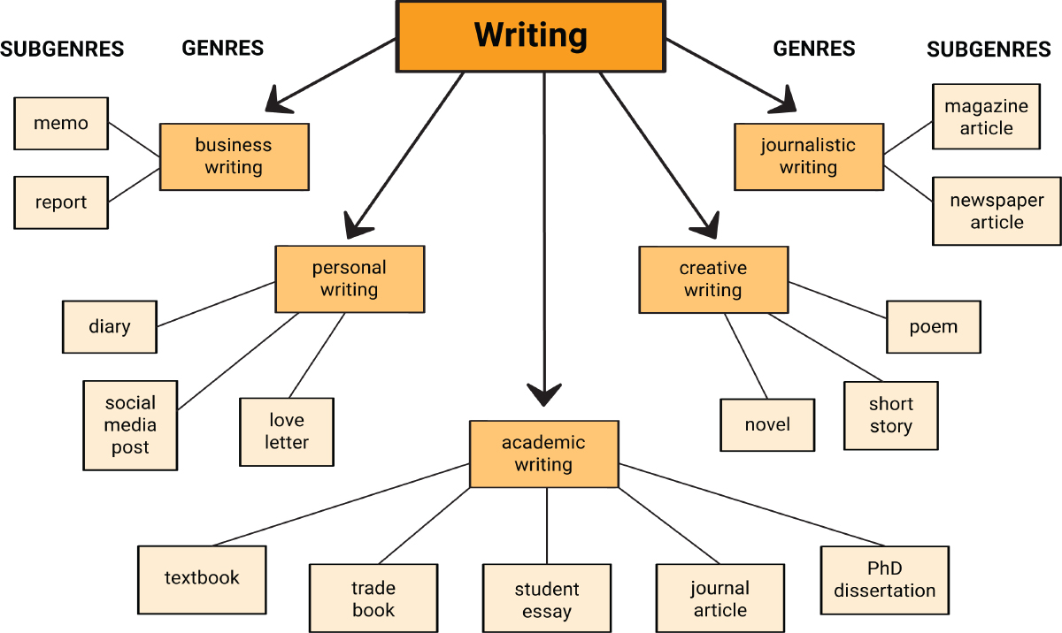 Within the broad genre of academic writing, there are many sub-genres, including textbooks, trade books, lab reports, journal articles, research proposals, dissertations, and undergraduate student essays. Figure 3.1: Genres and Sub-genres of Writing illustrates some of the many genres of writing and some of their many sub-genres.