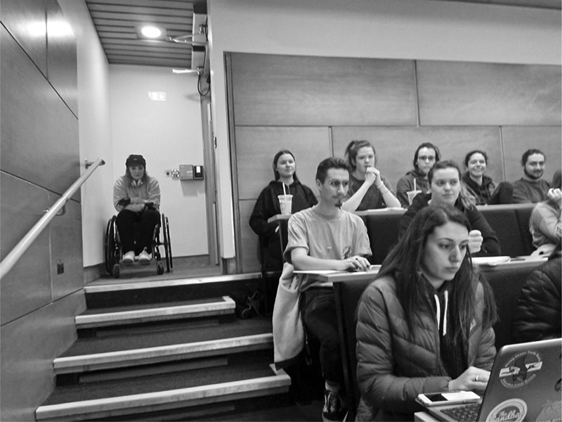 One way to think about how retrofits for disability function in higher education is to look at an image recently posted online by a student named Sarah-Marie Da Silva from the University of Hull. She posted the picture on Twitter, showing how she is forced to take in her zoology lectures. When she arrives at the lecture, there is only one place for her to sit, in the doorway at the back of the room. That doorway has a push-button entrance and an automatic door, allowing her to get into the room. But when she gets in, there is nowhere to go. There are stairs immediately in front of her, and they lead down to an amphitheater in which other students are seated at tables arranged one after the other, descending every three steps. Whenever anyone enters or leaves the room, Sarah-Marie needs to move. This is what so many of not only the physical but also the curricular and cultural layouts within higher education actually look like: disabled students might be able to get into the rooms, but their access is clearly an afterthought, and their participation is already minimized. No wonder we are losing so many disabled students.